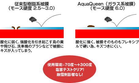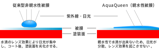 酸化要素である油脂分石油系溶剤や界面活性剤は一切使用しておりませんので、酸化による色褪せやひび割れ、劣化を起こさず、長時間効果を持続します。 また、親水性被膜であるため、水滴のレンズ効果による被膜損傷を防ぎます。